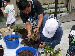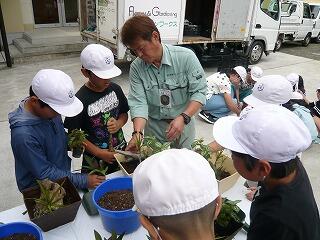 5月29日(水)の2時間目から3時間目にかけて、今年度の5年生・6年生の「もの作り教室」がありました。今年度は、「室内園芸技能士」の方4名に指導いただいて作品作りをしました。植物、流木、砂利、松ぼっくりの配置を自分なりに決めて、鉢の中に自分らしい庭を作っていきました。素材の選び方、置き方によって、こんなに違うのかと驚くくらいに、それぞれが個性あふれる作品を作り上げました。技能士の方は、短時間で室内に大型の庭園を造りあげるそうです。技能士の方々の技にふれることができた2時間でした。