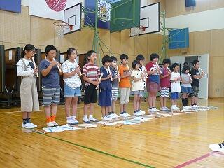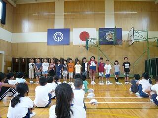 今日の業間は「こども集会」でした。今日の内容は、3・4年生の発表です。始めに、毎朝練習している「五十音」と「早口言葉」を群読しました。3・4年生15名は、方財小では一番多い学級人数です。15名がそれぞれに、息をいっぱいに吸い込んで、口を大きく開けて発声していました。次に、「ゆかいなまきば」の歌とリコーダーでした。部分的に歌とリコーダーに分かれての演奏でした。3年生は、4月からリコーダーを習い始めたのですが、4年生に混じって上手にリコーダーを演奏していました。これまでに4年生が一生懸命教えたのでしょう。最後は、「方財小バージョンのどれみの歌」でした。1番は、通常の歌詞で、2番は自分たちで考えた歌詞で歌いました。とても元気が良くて、見ている他の学年が楽しくなる発表でした。
