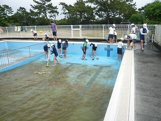 6月28日(金)にプール掃除を3年生~6年生が行いました。今年度の水泳学習は、昨年度までと違って1ヶ月おそく始まります。ですから、この時期にプール掃除となりました。緑色をしたプールでしたが、みんなで力を合わせてきれいなプールにしました。