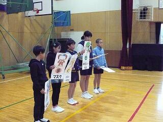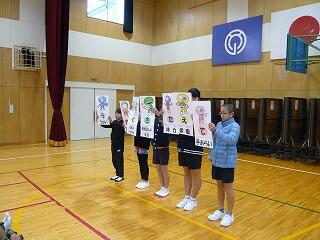 今日は、保健・給食委員会の児童が風邪やインフルエンザを予防するための合い言葉を呼びかけました。