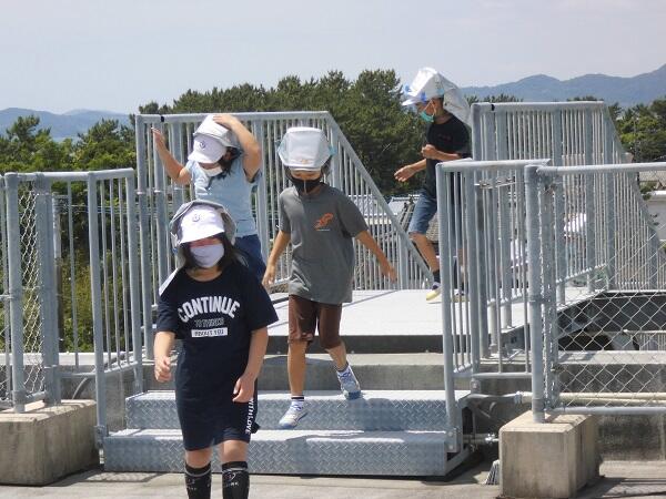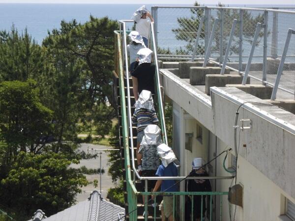今日は、避難訓練を行いました。日向灘で震度6の地震が発生したという想定で、屋上へ避難する訓練でした。第1次避難行動(机の下)から第2次避難行動(屋上へ)を全員が終えるまでにかかった時間は、3分42秒でした。