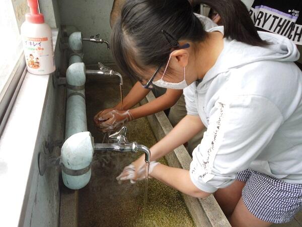 新しい生活様式の一つに挙げられている「手洗い」。今までも、給食前、清掃後など、必要に応じて手洗いをしていましたが、より確実に習慣化できるよう、業間の時間にも手洗いを設定し、担任の指導の下、手洗いを実行しています。