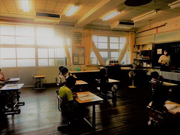 教室の窓や入り口の戸を、常時10cmほど開けて空気の入れ換えができるようにしています。暑さ対策、ウイルス対策で、気持ちよく、安心安全な環境で学習を進めていきます。