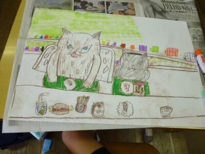 2年生の図工の時間の様子です。「そらのきっさてん」という絵本の感想画を描いています。