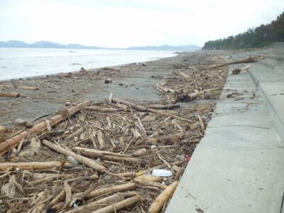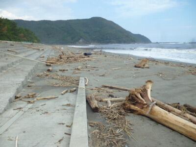 先日の台風14号の影響で、方財町の砂浜には大量の流木が流れ着いています。10月には、子ども達による「砂の造形」の活動を予定していたのですが、現在のところ実施できない見通しです。砂浜の南端では、重機が入って流木の撤去作業が始まっていますが、学校近くの砂浜がきれいになるには、まだまだ時間がかかりそうです。