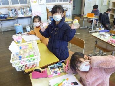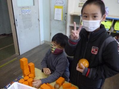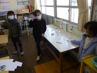 1・2年生の授業の様子です。1年生は、1年間いろいろと教えてくれた2年生に対して、感謝の気持ちを込めたメッセージカードを書いていました。2年生は、1年生と一緒に遊ぶためのボウリングなどの道具を作ったりしていました。
