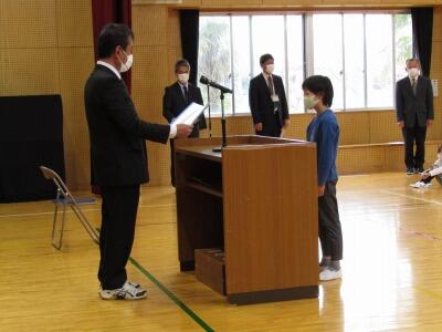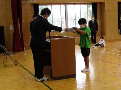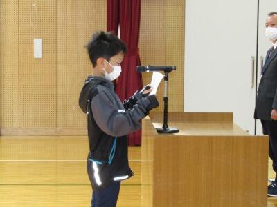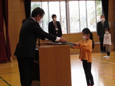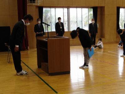 3月24日に、修了式を行いました。各学年の代表の子どもに、修了証書を授与した後、1年生と5年生の子どもが「3学期に頑張ったこと」を発表しました。