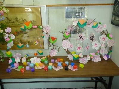 地域の方(いきいきはまゆうサロンさん)が、新しい掲示物を持ってきてくださいました。今回は、「入学おめでとう」バージョンです。桜やチューリップの花もきれいに飾っていただいています。
