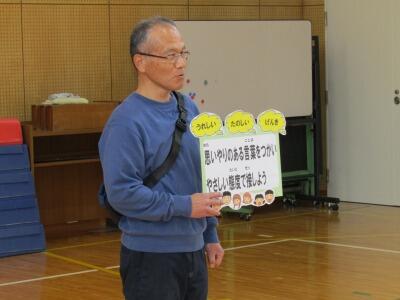 11月27日に、12月分の全校集会を実施しました。12月の目標である「思いやりのある言葉をつかい、やさしい態度で接しよう」に関連した指導を行いました。国でも、毎年12月4日~10日の1週間を「人権週間」と定めています。具体的には、子ども達に、「ふわふわ言葉」と「ちくちく言葉」について考えさせました。