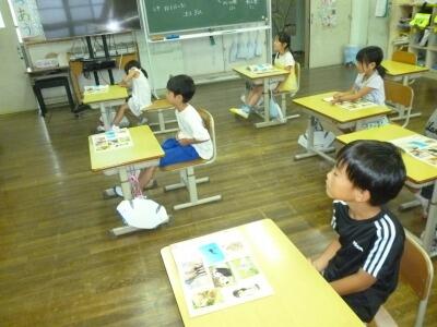 1・2年生の道徳の授業の様子です。「かぞくとおはなし」という学習で、動物(ペンギン、ゾウ、パンダなど)の親子がふれあっている写真を見て、どんなお話をしているかを想像していました。「家族愛」につながる学習内容です。