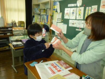 12月5日に、3・4年生を対象に、「歯の健康」に関する指導を行いました。「歯の役割」「むし歯の原因」「正しい歯の磨き方」などについて学んだ後、歯の模型を使って歯磨きの練習をしました。
