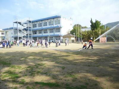 その後、方財小の運動場に集合し、保護者(看護師さん)による説明「骨折した方への対処法」や、消防団による放水訓練の見学、そして、図書室で「萌ぎの会」による読み聞かせ「琴姫の松 など」を聞きました。