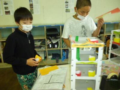 3・4年生の図工の時間の様子です。3階建ての建物のような教材「コロコロガーレ」に、穴を空けたり、紙で滑り台のような物を作って付けたりして、上からビー玉を転がして遊ぶ物です。子ども達のアイデアには、「なるほどなあ!」と思うものがあります。
