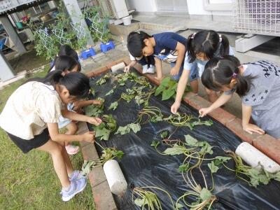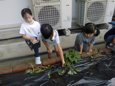 6月15日に、1・2年生の子ども達がサツマイモの苗を植えました。場所は、教室前の学級園です。秋に、大きなサツマイモが収穫できるといいですね。