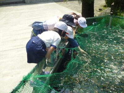 方財小学校には、池があります。時折子ども達がのぞいているので、話しかけてみると、カエルを探しているようです。中には、カエルをつかまえて、手にのせる子どももいます。