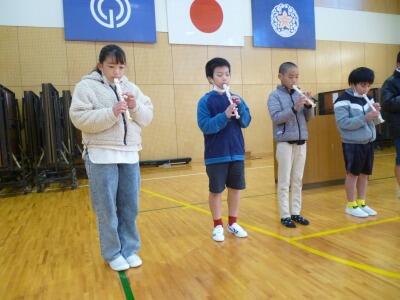 12月20日に、5・6年生のこども集会を行いました。内容は、「雨ニモマケズ」の暗唱、「風とケーナのロマンス」のリコーダー奏、むかばき宿泊学習やスポーツフェスタで学んだことの作文発表です。高学年らしい立派な発表でした。