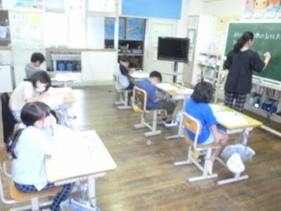 3・4年生の算数の授業の様子です。複式指導です。3年生は、「813-654」のような問題を、4年生は、「352÷5」のような問題を解いていました。
