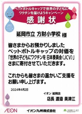 4月2日に、1年間で集まったペットボトルキャップをイオン延岡店に持っていきました。発展途上国の子ども達の健康に役立ててほしいと思います。