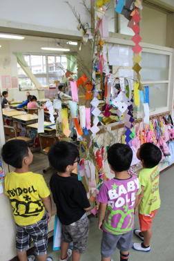 七夕飾りを眺める子どもたちの様子を紹介します。