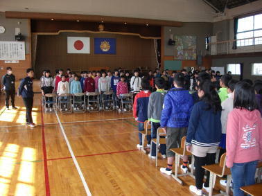 修了式では、1年生高木君、2年生山口君、3年生松田君、4年生中川君、5年生伊藤君がそれぞれの学年を代表して修了証(通知表)を受け取りました。