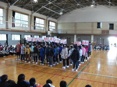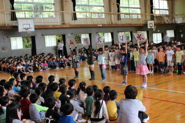 体育館で5年生と6年生が向かい合い、互いを意識しながら練習しました。