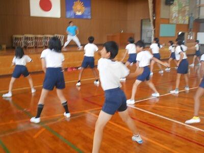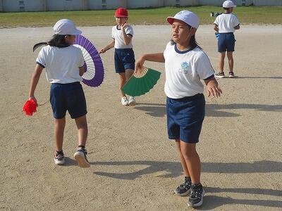 イィヤーサッサ-♪ 3年生はエイサー「ミルクムナリ」を練習中でした。バチとパーランクーをかっこよく構えて、先生のお手本に合わせて、息ぴったりの上手な踊りでした。後半は入場時の踊りにも挑戦。流行の曲と沖縄の伝統的な曲、二刀流を極める3年生です!