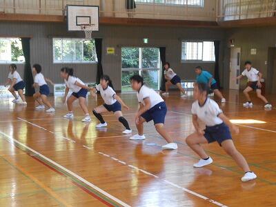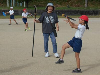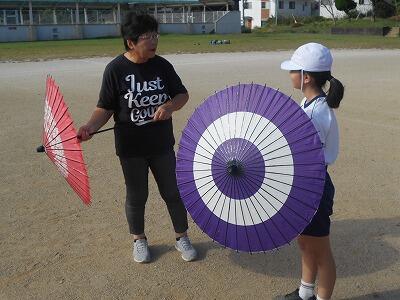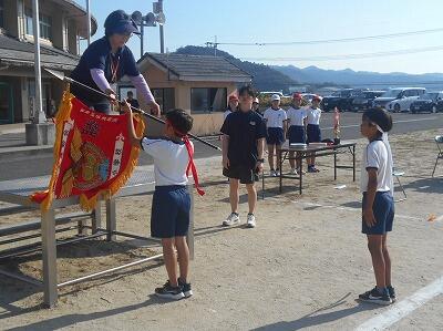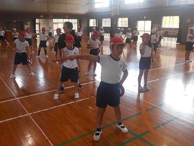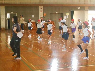 10月10日(金) 4年生の体育の時間の様子です。この日は稲葉崎団七保存会の方々に来ていただき、入場から退場まで、一連の動きを見ていただきました。