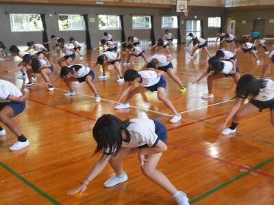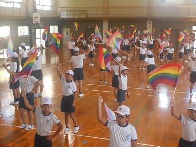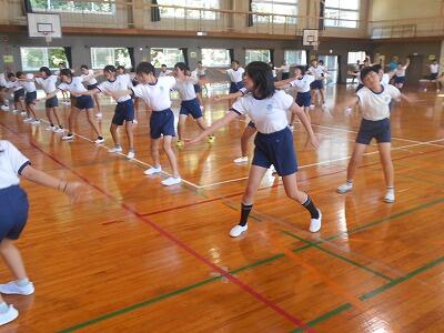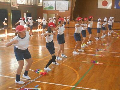 5年生は体育館でダンス練習です。カラフルな旗を手にして踊ります。運動場に広がったらきっと鮮やかに目に飛び込んでくることでしょうね。隊形移動を確認しながら練習を進めていました。「楽しそうな笑顔がいいね~」と担任の先生から声がかかると、それに応えるように、一段と笑顔の花が咲いていました。