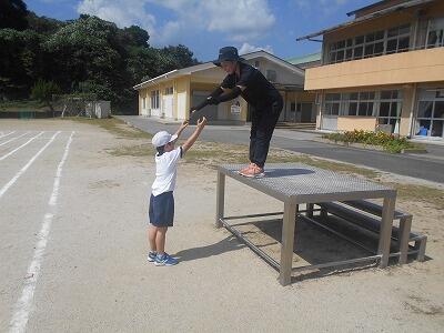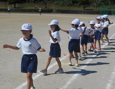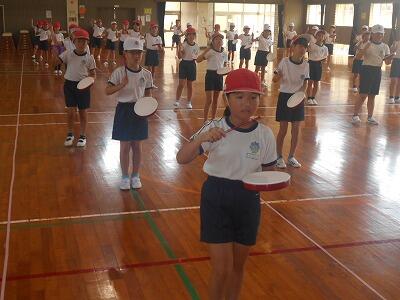 1年生は運動場でダンスとばんば踊りの練習です。初めての小学校の運動会、みんな楽しみにしていることでしょう。朝礼台の先生の動きを見つめて、一生懸命に踊っていました。広いグラウンドで自分の場所をしっかりと覚えて移動することもできました。「サイサイ」のかけ声もとっても元気です。みんなその調子でGO、GO!