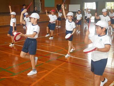 1年生は学年体育でした。延岡市レクリェーション協会の方々に来ていただき、ばんば踊りを親子で習いました。「やっとせぇ~え、やっとせ!」「サイサイ!」のおなじみの曲が流れると、なんだかとっても楽しい気持ちになってくるのはやはり延岡人の血でしょうか? 先生の姿を見ながら一生懸命に覚える姿、とってもナイスな1年生です!
