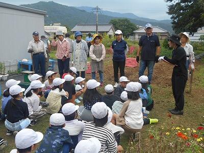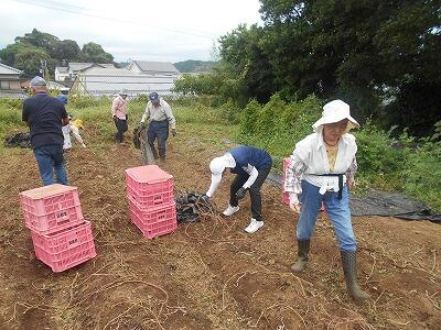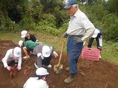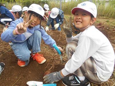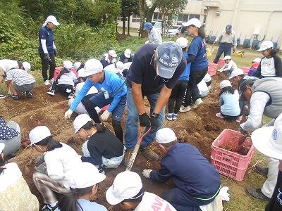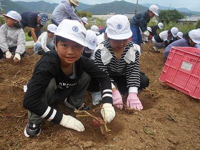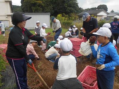 苗植えの際にもお世話になった「お芋名人」の井本様をはじめ、学校運営協議会委員や民生児童委員の方々など、地域の方々にもたくさん参加していただきました。写真は始まる前に子ども達が掘りやすいように準備して下さる様子です。元気にあいさつをして、いよいよ芋掘り開始です!