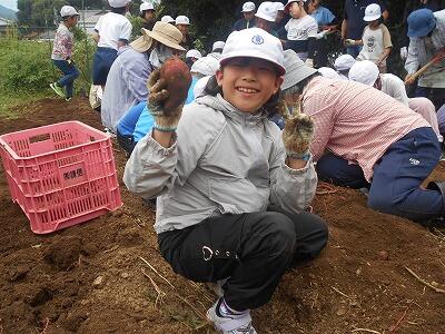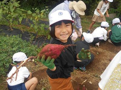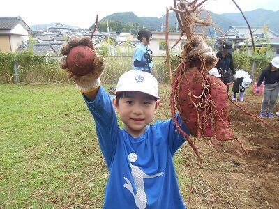 「おっきいのとれた~っ!」「ずっしりだあ」「かわいいのがとれました」子ども達はとれたお芋をとてもうれしそうに見せてくれました。土に思いっきり触れ、自然を満喫できたみんなの笑顔は輝いてます。