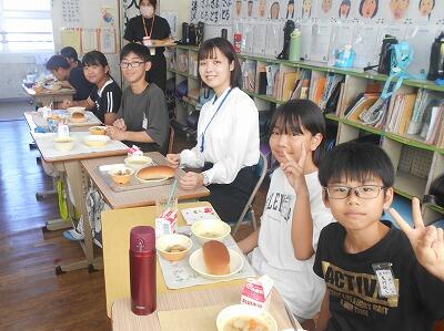 給食はフレンドリーな5年生と一緒に。一緒に食べることができてみんな大喜びです。