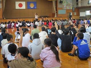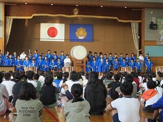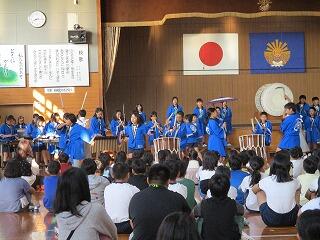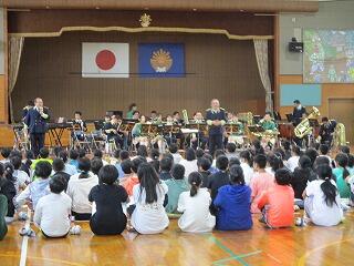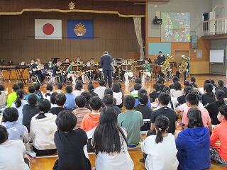 子どもたちの大好きなアニメソングや本校の校歌を演奏してくださったり、演奏に合わせて大きな旗を操る「カラーガード」も披露してくださったりしました。また、子どもたちが指揮者になるコーナーもあり、子どもたちの指揮に合わせて演奏してくださいました。選ばれた子どもたちは楽しそうに指揮棒を振っていました。
