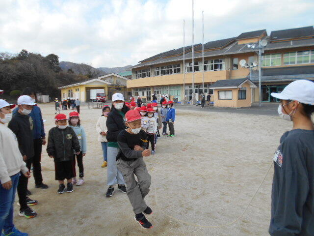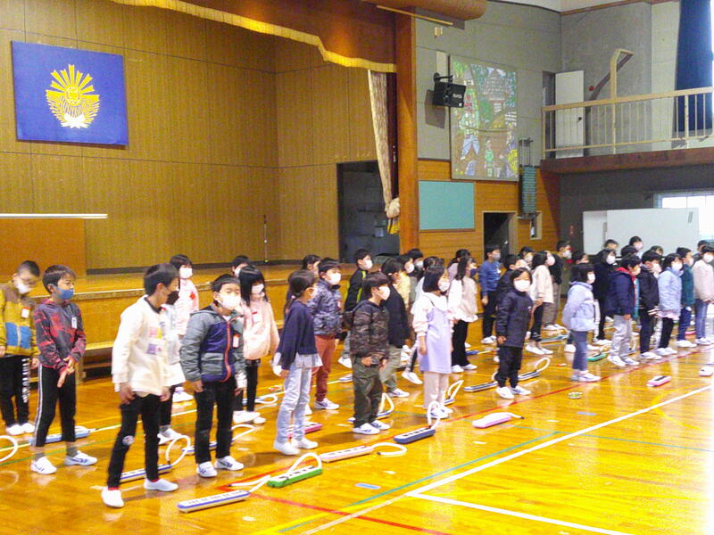 本日から2月10日(金)までの期間、「なわとび月間」に取り組みます。この取組は、体育委員会が主体となり、児童の体力向上、学級の仲間と協力し長縄を跳ぶことで達成感を味わわせることを目的とするものです。今日は、1年生が、長縄にチャレンジしていましたが、跳ぶタイミングが少し難しかったようです。これから1年生がどれだけ跳べるようになるか楽しみです。がんばれ1年生!