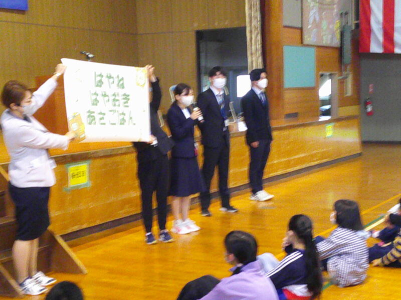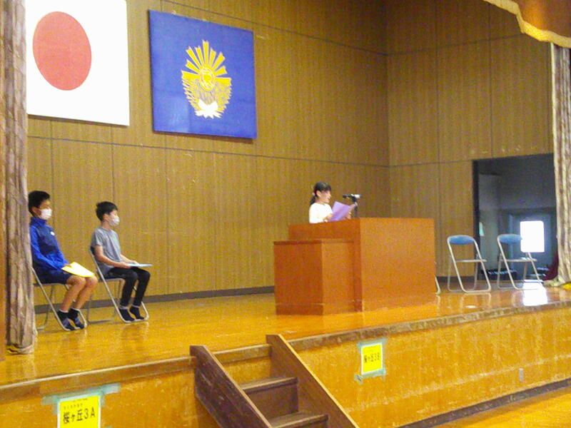 1時間目に全校集会を行いました。今回は、6年生と1年生の発表でした。6年生は平和学習をとおして学習してきたことを、自分たちの言葉でまとめ、一人ずつ交代で発表しました。平和に対する思いや命の大切さなど、学習を通して感じた感じた思いや願いを力強く発表してくれました。さすが6年生という発表でした。1年生は、「雨にも負けず」の群読、鍵盤ハーモニカによる「きらきら星」の演奏、そして、「きらきら星」の英語での合唱を元気よく発表してくれました。4月から立派に成長した1年生の姿に感動しました。群読も演奏も、そして歌も大変上手でした。今日の集会のためにがんばった6年生と1年生、素晴らしい発表ありがとうございました。