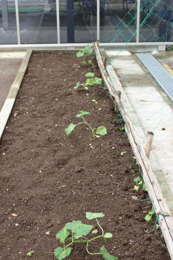 1年生教室横の花壇にキュウリを植え付けました。