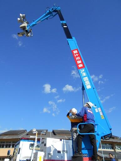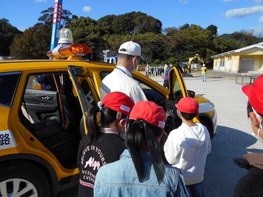 測量、重機、ドローン、照明車、パトロールカーなど、説明を受けたり、実際にさわったりしました。