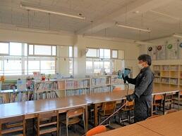 噴霧器による校舎内の消毒、手作業によるドアノブやスイッチ等の消毒を丁寧に行っていただきました。