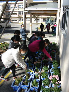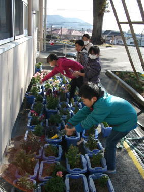 2時間目の休み時間に、北校舎前で3年生が一人一鉢に水をあげていました。