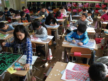 最初に1年生が生活科で“たこ”に絵を描いている様子です。