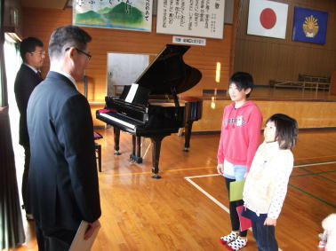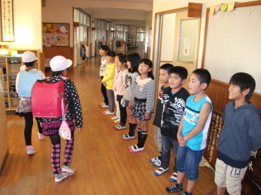 そんな静寂の中、7時半になると同時に、児童玄関からあいさつ運動の声が響いてきました。