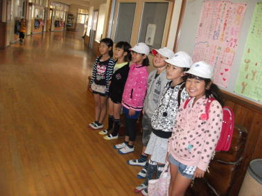 1、3、4、6年生の学級がある北校舎玄関で、6年1組のみなさんがあいさつ運動に取り組んでいました。