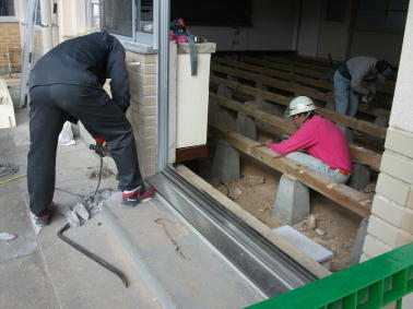 学習教室1の前に設置してある花壇のブロックを新しい物に替え、一直線に並べました。身を切るような風が吹く中、白石先生が作業されておりました。