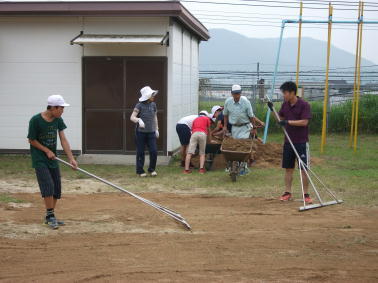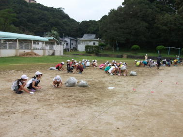 体育委員会のみなさんは、運動場への土入れも行いました。