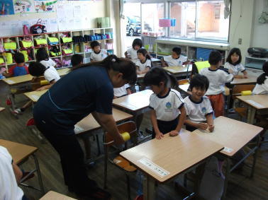 1年生の教室では、子どもたちが早速、補助具を取り付け、立腰を意識していました。