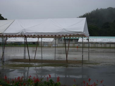 10月1日(木)、運動場に立つテントは降りしきる雨に打たれていました。