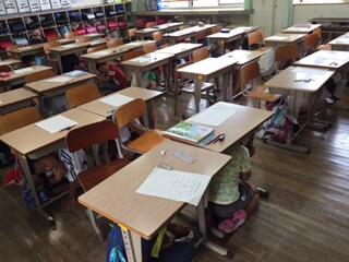 地震が起きたことを知らせる放送の後、子どもたちはさっと戸を開けて机の下に隠れることができました。