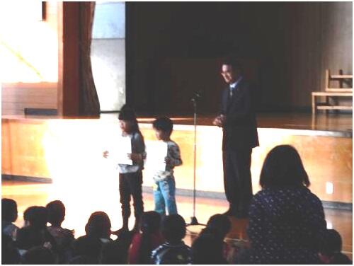 次に、1年生と4年生の代表児童が、2学期を振り返って作文発表をしました。