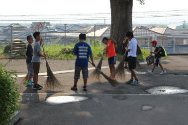 朝陽を浴びて、6年生が落ち葉を掃いていました。